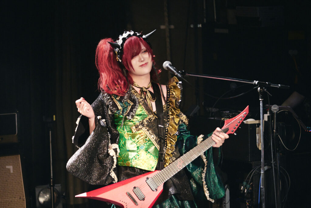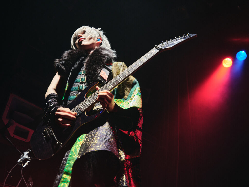 ここで、1人目のゲストであるレン(レイヴ)をステージへと呼び込んだ。神威は「ヴォーカルの在り方や酒の浴び方(笑)を教わった」とレンを紹介したのに対して、レンは神威のことを「かわいい九州の後輩」と話し、しばし同郷同士ならではの和気藹々とした空気が流れていた。こうして披露されたのは、実際に神威自身が九州時代に聴いていたというレイヴの『SETSUDAN』と『純情ビッチ』。神威は「自分がかっこいいと思うものをみんなにも教えたい」と気持ちを吐露する場面もあったが、自らが“かっこいい”と思う対象であるレンと共に歌う彼の姿からは、神威なりのヴィジュアル系に対する美学をステージへ反映するポリシーのようなものを感じることもできた。そして、ヴォーカル2人がお互いにグッドサインを交わして盛り上げた一幕を経て、間髪入れずに突入した『カミサマサマ』では、“大好き”というフレーズに晴夜(Gt)が神威にキスを迫るシーンも。後のMCで晴夜は「ギター持ちながらの愛情表現はキスしかない!」と話していた通り、メンバー同士のハートフルな様子が見られるのも、生誕ワンマンという特別公演といったところだろう。