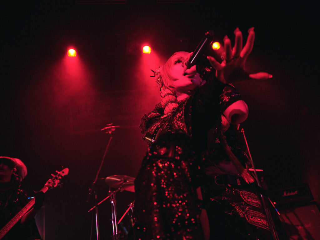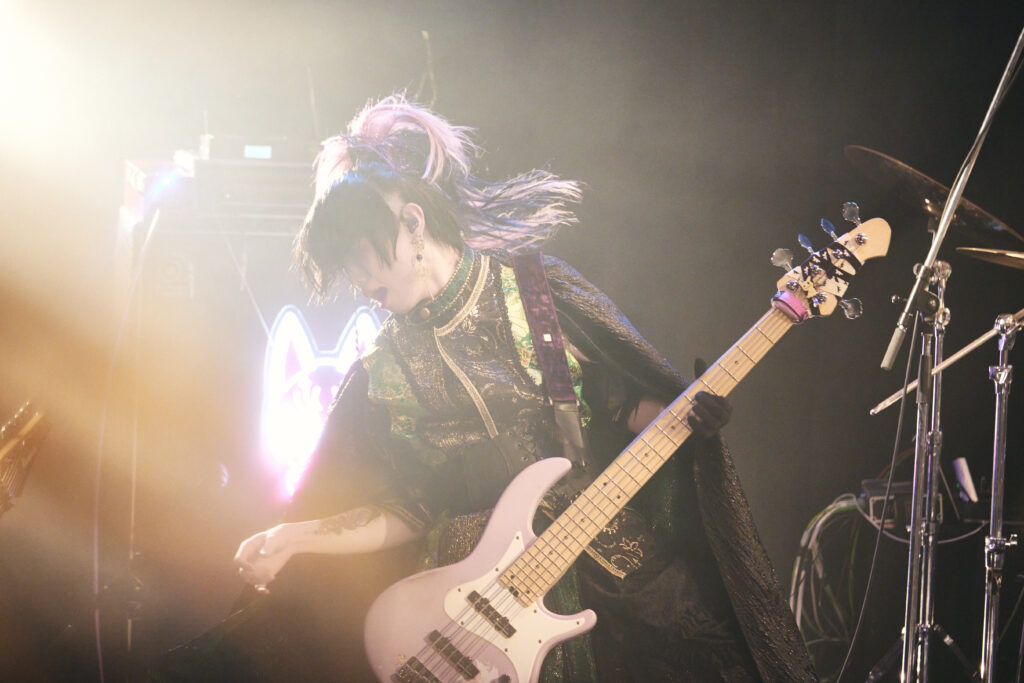 しかし空気は一変、『「秘密」』のようにせつない歌ものをじっくりと聴かせると、次に披露されたのは、なんと新曲の『神煙-shisha-』。ちなみに、どうやら“シーシャ”は神威のマイブームらしく、この曲の着想も興味深いところ。ここまで対人に対する“愛情”に重きを置いた楽曲が続いていたが、次に披露した『魔法少女は壊れない』こそ、ヴィジュアル系というカルチャーに対する愛情が根幹にあるからこそ生まれた楽曲でもある。そこへ“魔法少女”という斬新な発想を掛け合わせるところに、バンドのブレーンである神威の力量が発揮されているのは明確だが、曲の冒頭にサンプリングとして使われている呪文に合わせて皆で踊る情景を見るからに、それをバンド全体で形作っていくところに東京花嫁のスキルフルさを感じずにはいられない。