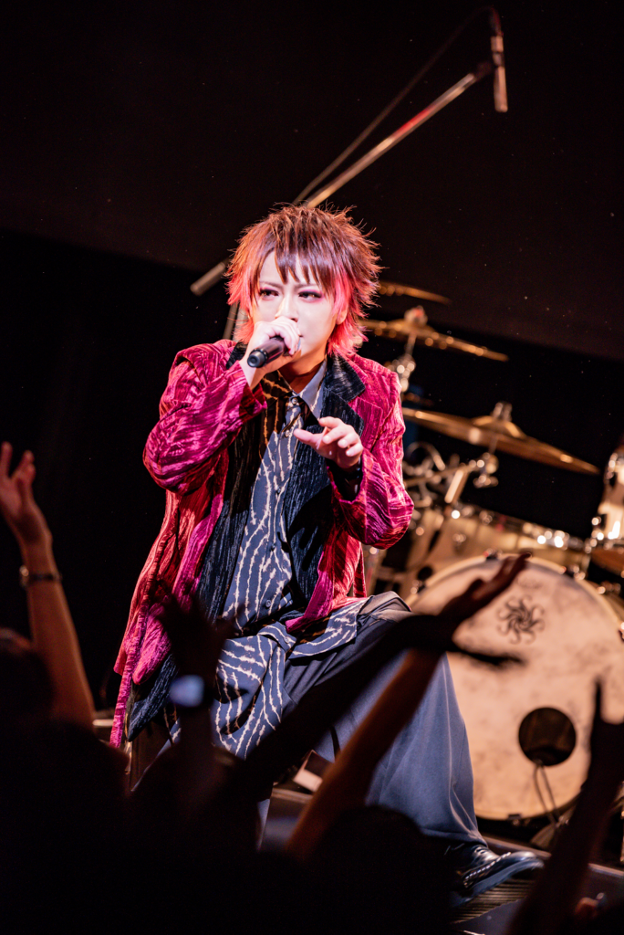 SEに乗せて一人ひとり姿を見せたメンバーは、すぐさま新曲「No Longer Human」からライブをスタートさせた。大方、威勢のいい一言をかましてから始めるところ、この日はJIN(Vo)が意を決したように「楽しもう」と告げたのみに留まっていたことからも、得も言われぬ緊張感を感じずにはいられなかったオープニング。新境地とも言える“恨み節”を込めた歌を抜群の歌唱力で聞かせるJINと、スタイリッシュながらもステージングにアグレッシヴさを欠かさない楽器隊とが一丸となって、なによりも“周年”という節目を最新曲から始めるところに気合いや誠実さを感じられた。しかし一変、「feeling」を皮切りに場内はパッと明るい空気へとシフトし、「BEST FRIEND」では演奏直前にJINが「見てみたい」とオーディエンスに求めた“18年間で最高のぐちゃぐちゃモッシュ“がフロアに巻き起こった様子は、まさしく圧巻。これほど月日を重ねてきたHEROですら、まだまだライブ中に見てみたい、または生み出したい情景があることをまっすぐに伝えていたこのシーンは、今もなお進み続けている姿勢を早々に見せつけているようでもあった。そして、ボルテージを最高潮へと伸し上げていく「罪と罰」では、メンバーをコールする間奏部分でyusuke(Dr)が叩きつけたドラムが一際力強く、同時にYU-TAはフロアに向けるように掲げていたマイクスタンドをシモテの袖へと放って見せ、パフォーマンスの一つひとつから垣間見れるアヴァンギャルドさには、思わず身震いしてしまうほどの迫力があった。